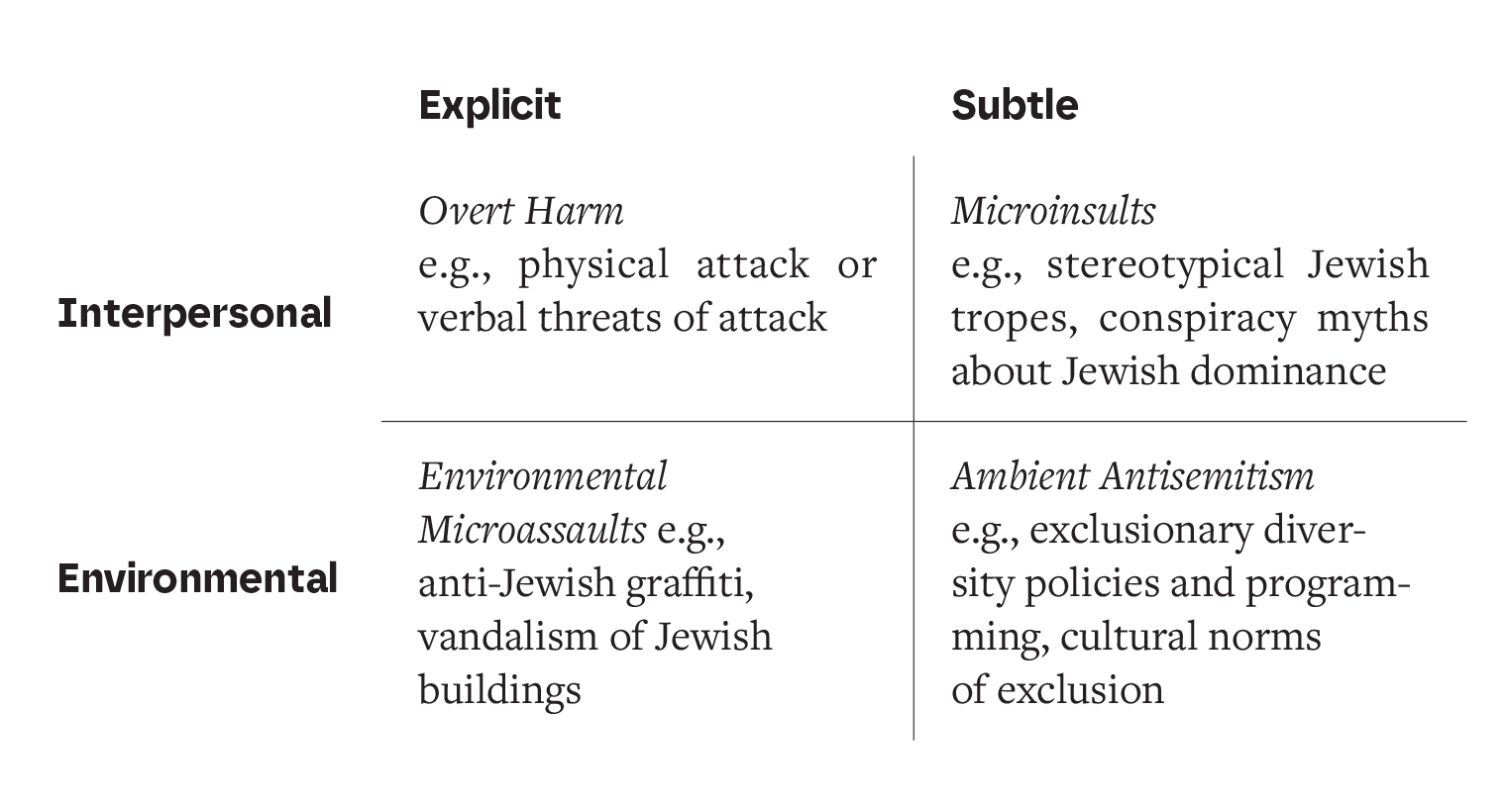 Psychologists describe the ways in which bias is expressed as ranging across a spectrum from overt hostility to subtle discrediting. Explicit antisemitism manifests through concrete acts: vandalism, slurs, threats, violence. Ambient antisemitism, by contrast,is more subtle and lives upstream, embedded in institutions and cultures, where unspoken norms quietly define which identities are considered legitimate and which are merely tolerated.