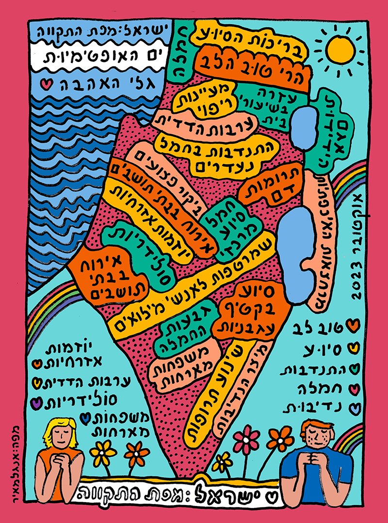 In the days immediately following October 7, visual and performance artist Ze’ev Engelmayer released Map of Pain, and soon after, Map of Hope—two drawings that transform Israel’s geography into an emotional landscape. The first renders the country as a single field of collective paralysis: every region renamed for grief, fear, and anxiety, its dark colors dissolving the boundaries between individual and national pain. The image is framed by Munch’s The Scream, a haunting emblem of shared terror and helplessness. The second, created shortly afterward, reuses the same geography but fills it with light and warmth, supplanting The Scream with a radiant sun and replacing anguish with gestures of generosity, volunteering, and care. Together, the two maps trace a movement from solidarity in pain to solidarity in action—from a nation frozen by trauma to one mobilized by compassion.